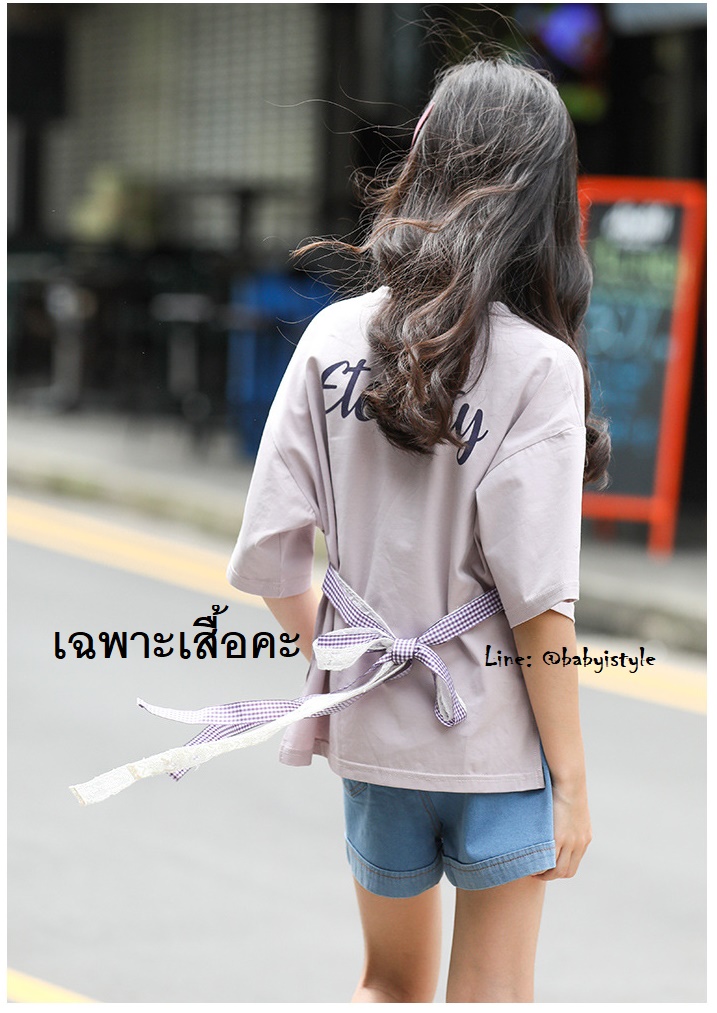 เด็กโต-เสื้อครอปแขนสั้นสีชมพูกะปิสกรีน Grace ผูกริบบิ้น+ลูกไม้หลัง ผ้าดียืดหยุ่นได้ (ไม่รวมกางเกง)