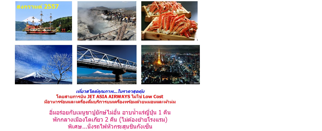 EBGH: ทัวร์ญี่ปุ่น [ฟูจิ-โตเกียว] ซากุระ SAKURA ECO TOKYO- 6 วัน 3 คืน โดยสายการบินไทย (TG-APR05) EBCP-DL(S): ทัวร์ญี่ปุ่น เที่ยวโตเกียว ช่วงสงกรานต์ 5 วัน 4 คืน โดยสายการบิน Delta Airlines EBGH: ทัวร์ญี่ปุ่น SAKURA ECO TOKYO [ฟูจิ-โตเกียว] 5 วัน 3 คืน โดยสายการบินไทย (TG-APR02) EBCP: ทัวร์ญี่ปุ่น โตเกียว วันจักรี 4-8 เมษายน 2557 : 5 วัน 3 คืน สายการบินเจ็ทเอเชีย EBMS: ทัวร์ญี่ปุ่น โตเกียว ฟูจิ 5 วัน 3 คืน โดย AsianAilrines