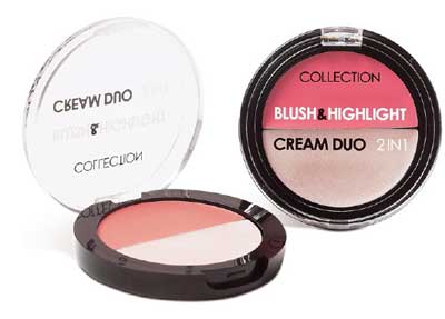 COLLECTION Blush & Highlight Cream Duo ประกอบด้วยบลัชสีสวยและไฮไลท์เนื้อครีม บลัชเชอร์สูตรครีมใช้ก่อนทาแป้ง เกลี่ยง่ายเพียงแค่ปลายนิ้วเพื่อพวงแก้มที่สวยติดทนตลอดวันและดูเป็นธรรมชา ติกว่าบลัชแบบฝุ่น ไฮไลท์เนื้อครีมสารพัดประโยชน์ ที่แต่งแต้มก่อนการลงแป้งบริเวณโหนกคิ้ว โหนกแก้ม สันจมูก ส่วนที่ต้องการแสงเงาที่สว่าง หรือแม้กระทั่งริมฝีปากบนเพื่อสร้างแสงเงาให้เรียวปาก