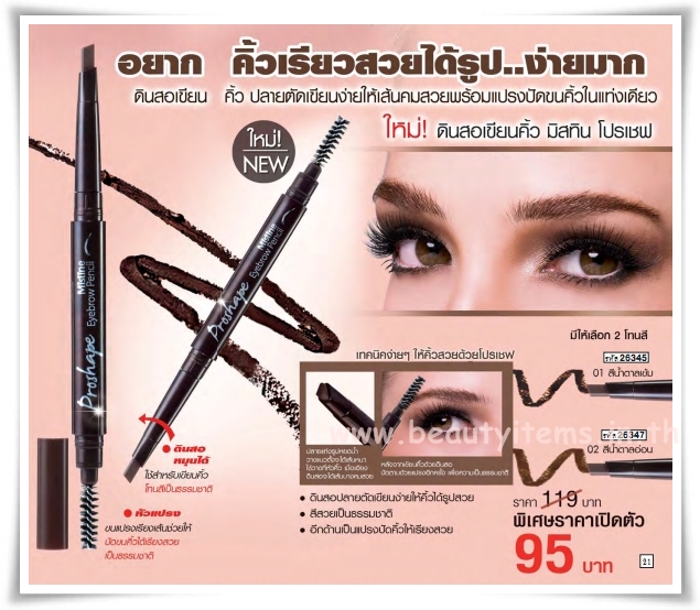 ดินสอเขียนคิ้วแบบใหม่ที่ออกแบบหัวดินสอมาเป็นพิเศษเืพื่อใ้ห้เขียนง่าย และสามารถควบคุมการวาดเส้นได้เป็นอย่างดี ได้สีที่เป็นธรรมชาติ เขียนติดทนระหว่างวัน ปลายแท่งมีแปรงช่วยปัดขนคิ้วให้เรียงเส้นได้เป็นอย่างดี และให้เส้นที่เขียนดูเป็นธรรมชาติ