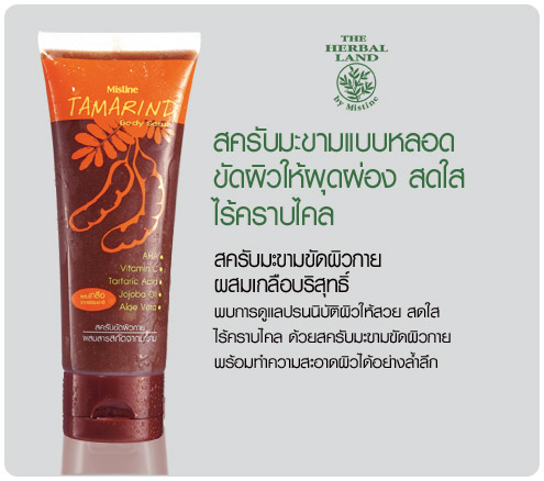 สครับขัดผิวกายที่มีส่วนผสมของเนื้อมะขามเเท้และเกลือบริสุทธิ์จากธรรมชาติ AHA จากเนื้อมะขามที่ช่วยผลัดเซลล์ผิวที่เสื่อมสภาพให้หลุดออกไป