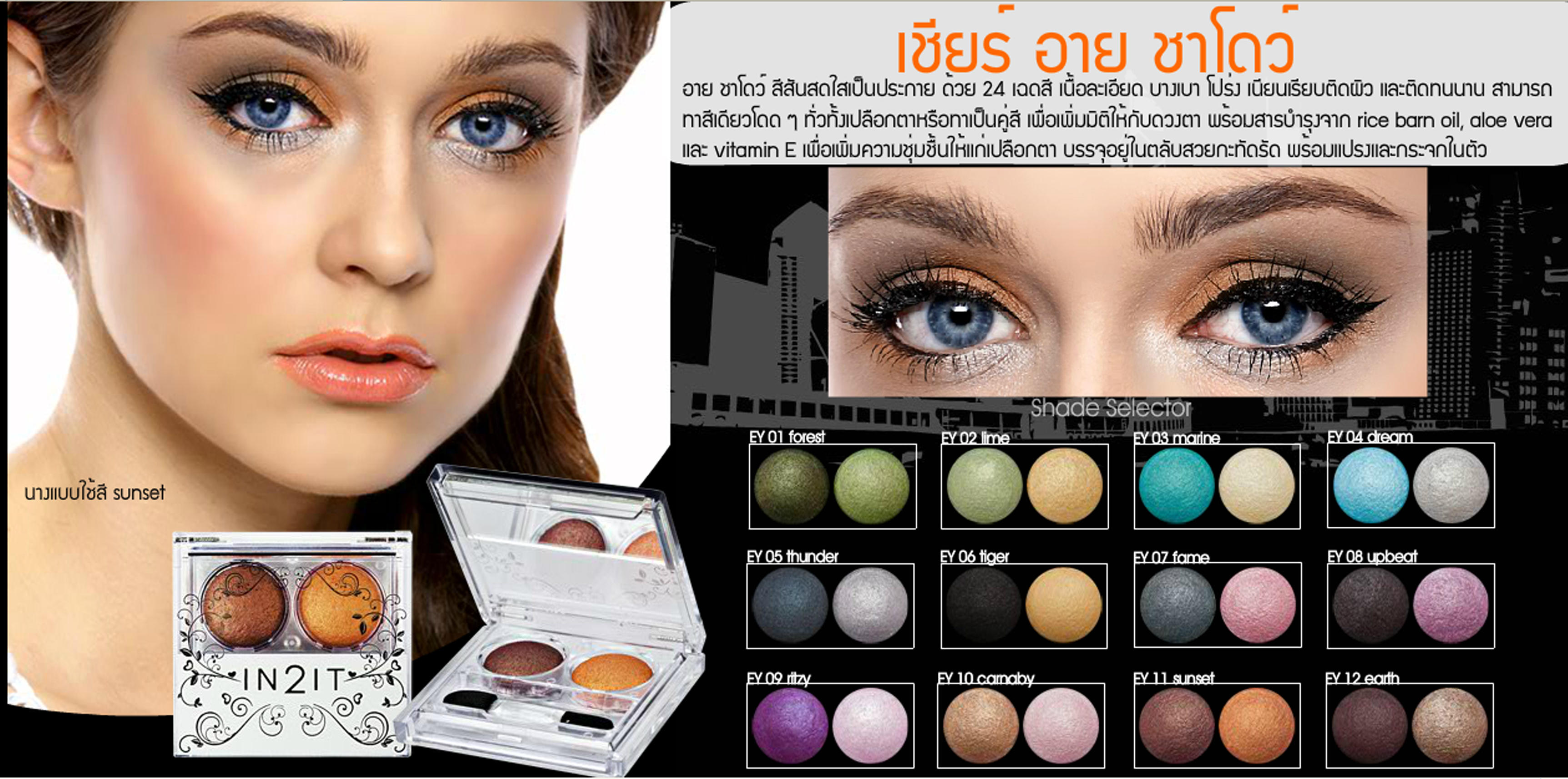 อาย ชาโดว์ เนื้อนุ่มละเอียดบางเบาในรูปแบบตลับ พร้อมกระจก ด้วย 10 คู่เฉดสี ให้สีสันสวยงาม เป็นประกายสดใส สวยสะดุดตา เนื้อสีโปร่งเนียนเรียบติดผิว และติดทนนาน สามารถทาสีเดียวโดดๆ ทั่วทั้งเปลือกตา หรือทาเป็นคู่สีเพื่อเพิ่มมิติให้กับดวงตา พร้อมด้วยสารบำรุงจากน้ำมันรำข้าว ว่านหางจรเข้ และวิตามิน อี เพื่อเพิ่มคามชุ่มชื้นให้แก่เปลือกตา