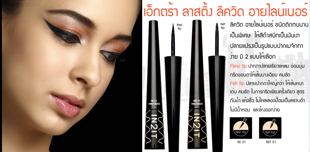 อายไลน์เนอร์ ชนิดน้ำ ให้สีดำสนิทเป็นมันเงา กันน้ำ และติดทนนานเป็นพิเศษ ไม่ไหลเลอะเปื้อนเป็นคราบดำรอบดวงตา ปลายแปรงเป็นรูปแบบปากกาเมจิกง่ายต่อการวาด
