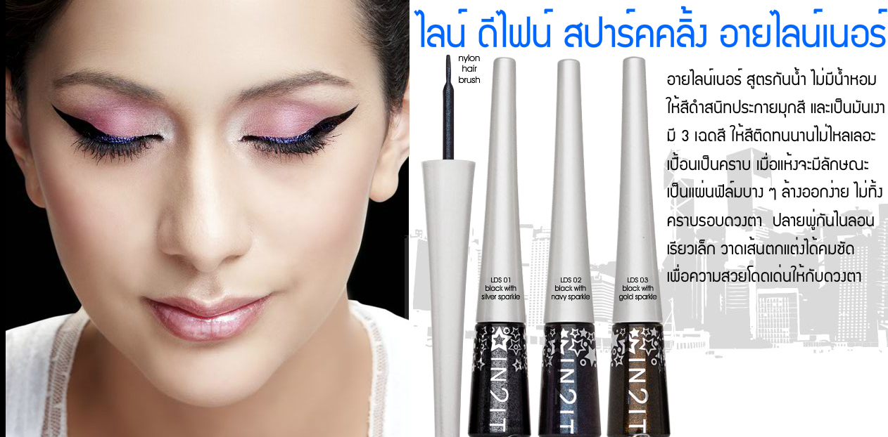 อายไลน์เนอร์ในรูปแบบน้ำ ให้สีดำสนิทประกายมุกสี และเป็นมันเงา สูตรกันน้ำไม่ไหลเลอะเปื้อนเป็นคราบ เมื่อแห้งจะมีลักษณะเป็นแผ่นฟิล์มบางๆ ล้างออกง่าย ไม่ทิ้งคราบรอบดวงตา ปลายพู่กันไนลอนเรียวเล็ก วาดเส้นตกแต่งขอบตาให้คมเข้ม เพิ่มความสวยโดดเด่นให้กับดวงตา ดูน่าหลงใหลยิ่งขึ้น