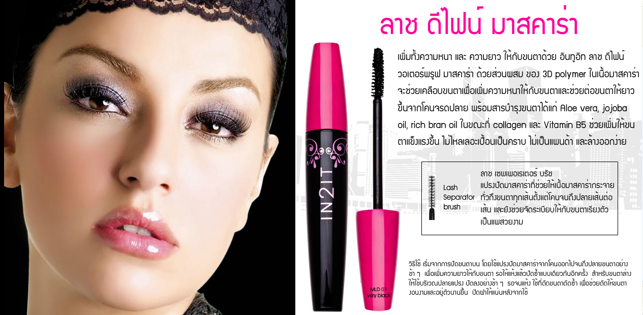 มาสคาร่าสูตรกันน้ำติดทนนานตลอดทั้งวัน (ชนิดไม่มี fibre) ไม่ไหลเลอะเป็นคราบดำรอบดวงตา และล้างออกง่าย จึงช่วยถนอมผิวบริเวณรอบดวงตาด้วยเนื้อฟิล์ม 3D โพลิเมอร์ ช่วยเคลือบขนตา เพิ่มความหนาและต่อขนตาให้ยาวขึ้น พร้อมด้วยสารบำรุงขนตา วิตามิน B5 และ Collagen
