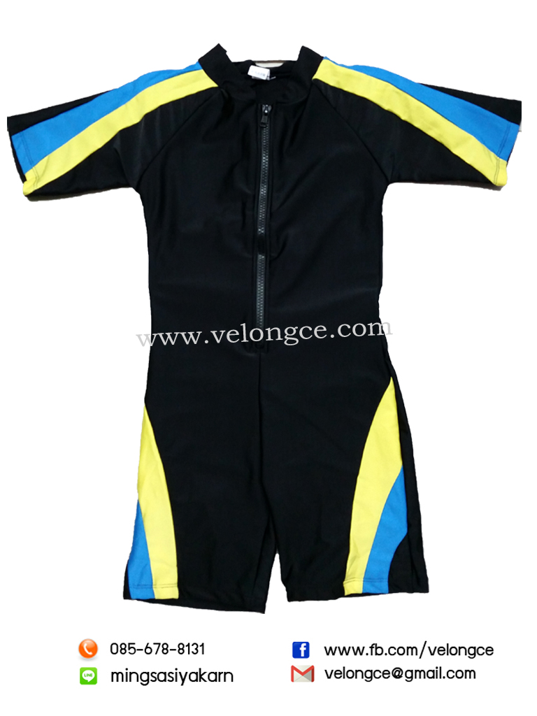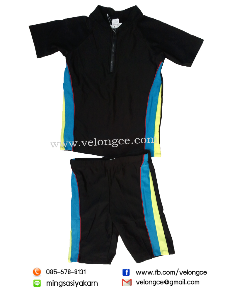 ชุดว่ายน้ำเด็กชื้นเดียวมีซิปหน้า แขนยาวขาสั้น ตัวชุดเป็นพื้นสีดำ แขนมีแถบสี Size 8-10-12-14-16-18-2