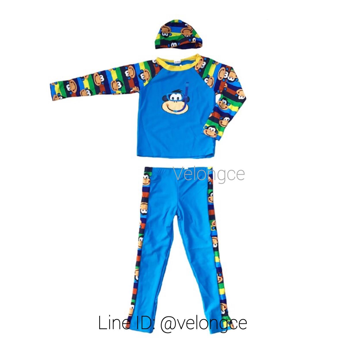 ชุดว่ายน้ำเด็ก 2 ชิ้น แขนยาว ลายลิงน่ารัก มาครบเซ็ท เสื้อ กางเกง และหมวก size S,M,L,XL,XXL