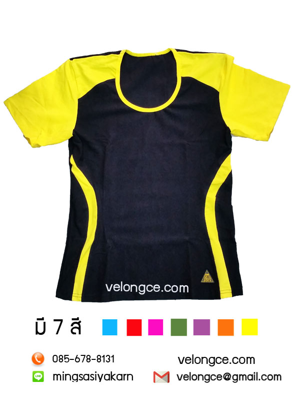 เสื้อแอโรบิคเนื้อคอตตอนอย่างดี แขนสั้น มีกุ้นสีเหลือง ฟ้า แดง ส้ม เขียว ม่วงและชมพู