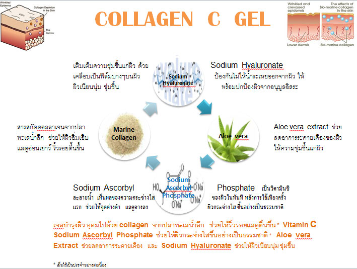 รายละเอียด: เจลใสสีส้มผสม Collagen + Vitamin C ช่วยให้ผิวตึงกระชับพร้อมๆกับความขาวกระจ่างใส