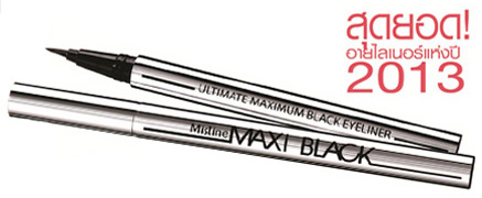 อายไลเนอร์ มิสทิน/มิสทีน แม็กซี่ แบล็ค เพิ่มความดำมากยิ่งขึ้น เพื่อดวงตากลมโตขึ้น ปลายภู่กันแหลมเล็กเขียนง่าย ตวัดหางให้ได้เรียวแหลมดังใจ น้ำหมึกไหลลื่นต่อเนื่องสม่ำเสมอ ติดทนนานยิ่งขึ้น พร้อมคุณสมบัติ กันน้ำและน้ำตา ล้างออกง่ายด้วยน้ำเปล่า