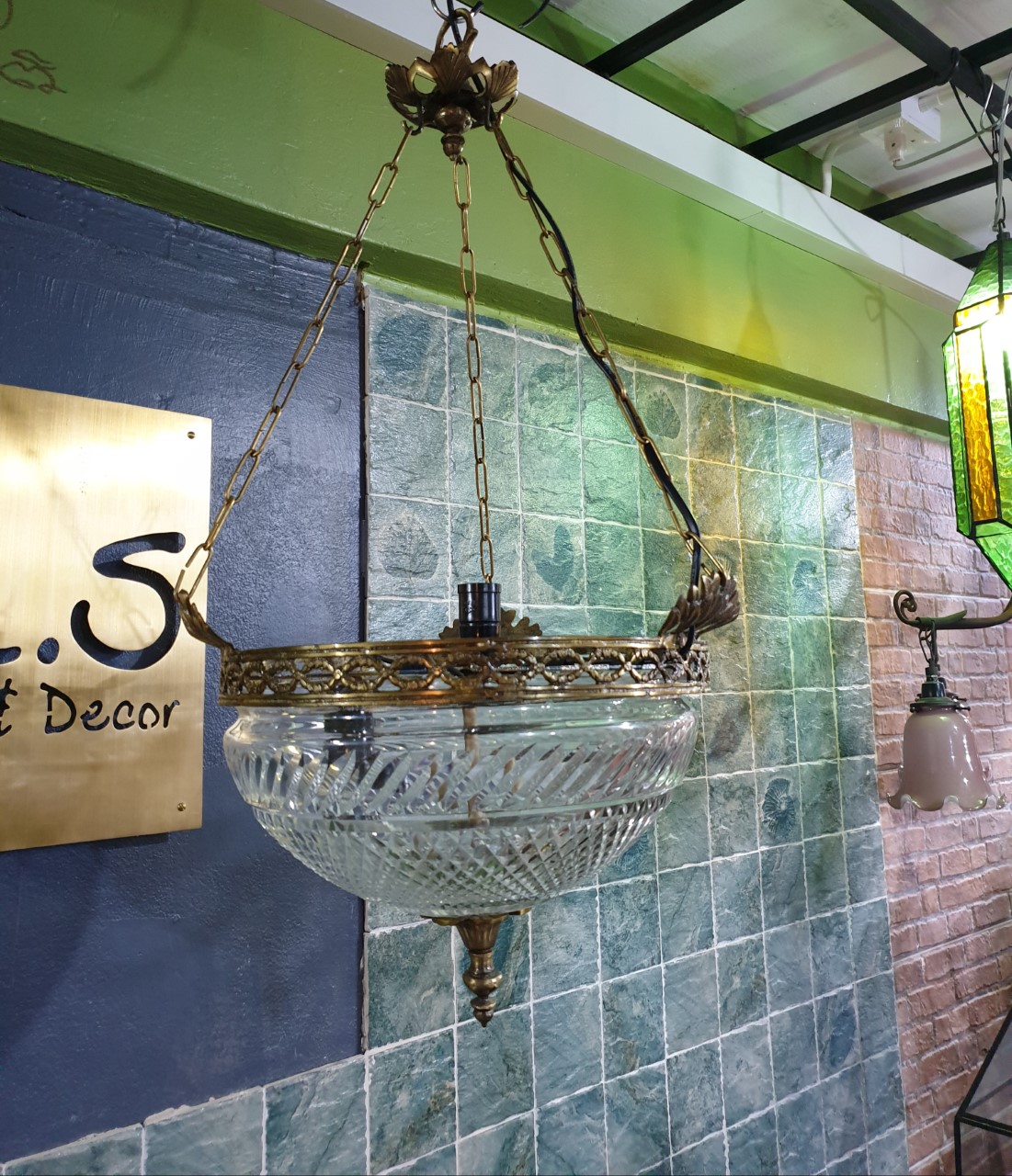 Hanging Lamp brass with cut glass Item Code HGLH30 size wide 300 mm long 600 mm.